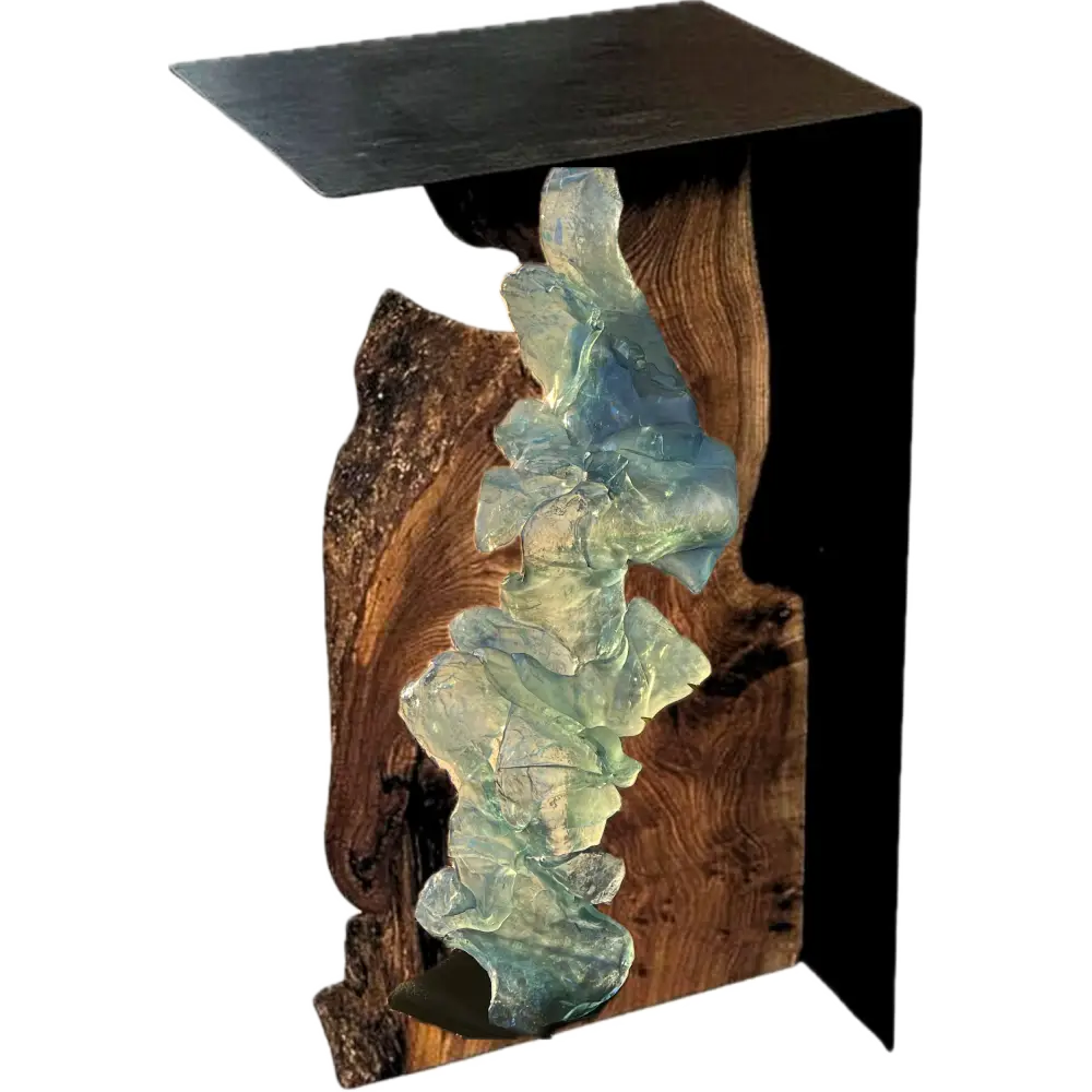The Alma accent table is a harmonious blend of durability and artistic allure. It reflects the wisdom of an old soul, revitalized through the alchemy of glassmaking’s layering technique. The metallic frame, sleek and minimalistic with a bold black finish, creates an elegant contrast to the organic, flowing shapes of the luminous blue and green glass. This captivating composition frames an optical illusion of uninterrupted breath—a story expressed through form and texture, designed to be felt, admired, and cherished for years to come.
